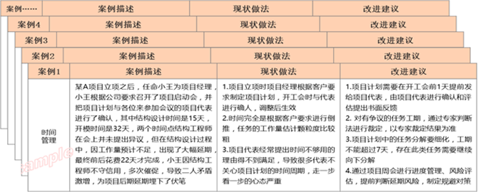顧問組織項目經理學員圍繞實際項目案例展開相關研討和實戰(zhàn)演練,如WBS工作分解,項目估計,組織評審等。在課程結束后,根據課程內容及企業(yè)實際項目提供精心設計相關的課后試題及參考答案,供學員檢驗學習成果,查漏補缺。